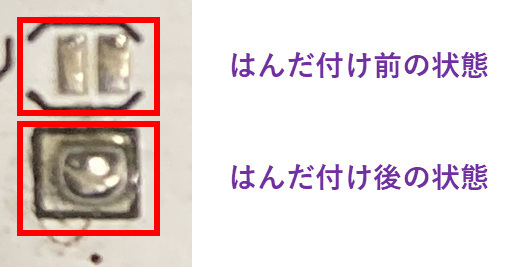 離れているはんだをくっつけるようにはんだ付けすることで、導通状態になります。